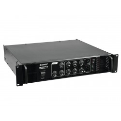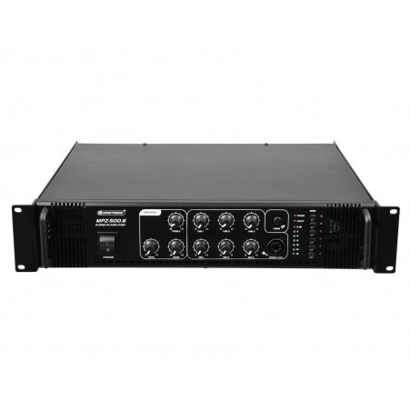 Enormous reliability with a maximum of flexibility The Omnitronic MPZ-500.6 ELA mixer amplifier is your reliable partner for ELA sound reinforcement systems. Thanks to its 19" format, it is ideally suited for both mobile and permanent installations. Outputs for ELA loudspeakers with 70 V and 100 V audio transformers or 4-16- Ohm loudspeakers leave nothing to be desired. In addition, you can also connect a device with line level (e.g. mixing console) to the line output. With 6 mixable inputs you are always flexible. Connect up to 3 microphones and 3 line level devices. Control your ELA speakers conveniently via the 6 zone outputs of the MPZ-500.6. They can be switched separately on the front panel. For you, this means the greatest possible adaptability when implementing your sound reinforcement concept.Make yourself heard! The microphone input at the front has an adjustable priority switch. It allows you to make important announcements with automatic, continuously adjustable level reduction of all signals. You can also use the gong to draw attention to your announcement. Protective functionsA fan protects the interior of your MPZ-500.6 from overheating. In addition to a switch-on delay, it has protection circuits against overvoltage and short-circuits. In these cases, your loudspeakers are electrically isolated from the amplifier. This protects both the MPZ-500.6 and your speakers from damage.