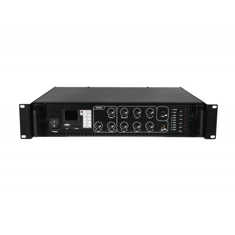 Enormous reliability with a maximum of flexibility The Omnitronic MPZ-350.6P ELA mixer amplifier is your reliable partner for ELA sound reinforcement systems. Thanks to its 19" format, it is ideally suited for both mobile and permanent installations. Outputs for ELA loudspeakers with 70 V and 100 V audio transformers or 4-16- Ohm loudspeakers leave nothing to be desired. In addition, you can also connect a device with line level (e.g. mixing console) to the line output. With 6 mixable inputs you are always flexible. Connect up to 3 microphones and 3 line level devices. Control your ELA speakers conveniently via the 6 zone outputs of the MPZ-350.6P. They can be switched separately on the front panel. For you, this means the greatest possible adaptability when implementing your sound reinforcement concept.The MPZ-350.6P also offers you an MP3 player with infrared remote control and blue backlit LCD display. It has both an SD card slot and a USB port. So you can spontaneously and flexibly play music titles from a storage medium of your choice.Make yourself heard! The microphone input at the front has an adjustable priority switch. It allows you to make important announcements with automatic, continuously adjustable level reduction of all signals. You can also use the gong to draw attention to your announcement. Protective functionsA fan protects the interior of your MPZ-350.6P from overheating. In addition to a switch-on delay, it has protection circuits against overvoltage and short-circuits. In these cases, your loudspeakers are electrically isolated from the amplifier. This protects both the MPZ-350.6P and your speakers from damage.