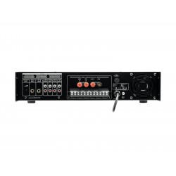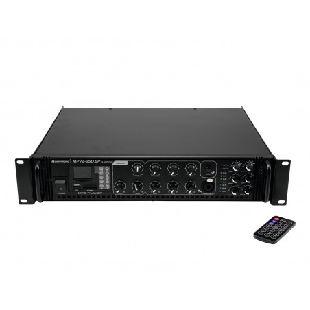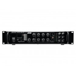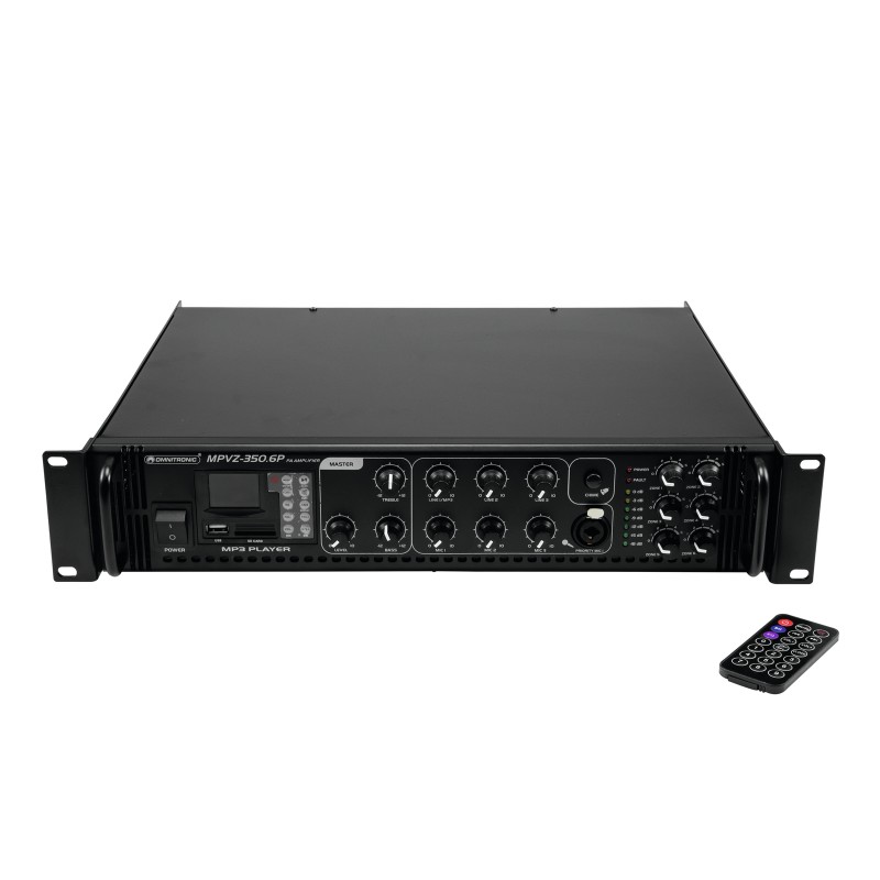 Enormous reliability with a maximum of flexibility The Omnitronic MPVZ-350.6P ELA mixing amplifier is your reliable partner for ELA sound reinforcement systems. Thanks to its 19" format, it is ideal for both mobile and permanent installations. Outputs for ELA loudspeakers with 70 V and 100 V audio transformers or 4-16- Ohm loudspeakers leave nothing to be desired. In addition, you can also connect a device with line level (e.g. mixing console) to the line output. You are always flexible with 6 mixable inputs. Connect up to 3 microphones and 3 line level devices. Control your ELA speakers conveniently via the 6 zone outputs of the MPVZ-350.6P. They are separately adjustable on the front panel with a 5-stage volume control. For you, this means the greatest possible adaptability when implementing your sound reinforcement concept.The MPZ-350.6P also offers you an MP3 player with infrared remote control and blue backlit LCD display. It has both an SD card slot and a USB port. So you can spontaneously and flexibly play music titles from a storage medium of your choice.Make yourself heard! The microphone input 3 on the front panel has an adjustable priority switch. It allows you to make important announcements with automatic, continuously adjustable level reduction of all signals. Use the gong to draw additional attention to your announcement. ProtectionA fan protects the interior of your MPVZ-350.6P from overheating. In addition to a switch-on delay, it has protection circuits against overvoltage and short-circuits. In these cases, your speakers are electrically isolated from the amplifier. This protects both the MPVZ-350.6P and your speakers from damage.