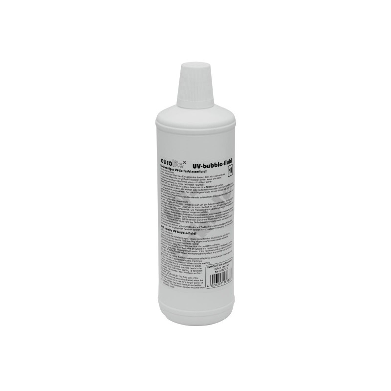 Ready-to-use UV-active bubblesEUROLITE's ready-to-use bubble liquid produces normal bubbles under standard lighting conditions. When exposed to UV light, the bubbles start to glow reddish, making it the ultimate hit for discos, parties and concerts.The EUROLITE UV bubble fluid is made in Germany.