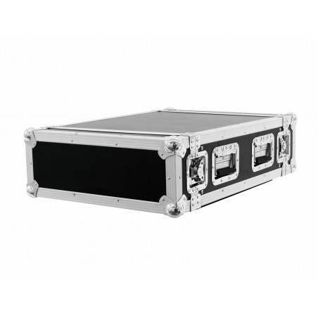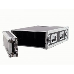 Flightcase for 483 mm devices (19")The ROADINGER amplifier rack PR-2ST including rack rails with 4 U is ideally suited for your 19" equipment such as power amplifiers and other additional equipment. The maximum installation depth is 550 mm plus 90 mm per cover. The high-quality workmanship with multi-layer glued wood and the aluminium profile frame with rounded corners as well as the three-legged, medium-sized steel ball corners provide stability. The amplifier rack is equipped with four high-quality butterfly locks, four chrome-plated case folding handles and two wooden sliding rails on the bottom. Both lids are removable (double door version).The maximum load is 50 kg.