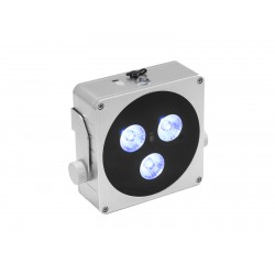 Flat headlight with 3x8 W RGBW LED, Quick DMX transceiver & bracketThe flat spotlight EUROLITE AKKU Flat Light 3 is wireless, flexible and versatile. It is equipped with three powerful 8-watt LEDs (4in1) in red, green, blue and white. If you are looking for a spotlight that does not take up much space and is suitable for use on stages, in discotheques, theatres, bars or even for mobile use, the AKKU Flat Light 3 is the perfect choice. With an operating time of up to 16 hours with the built-in rechargeable battery, the spotlight is ideal for mobile use.The compact and powerful spotlight is housed in an elegant housing. The angle of inclination can be adjusted manually via the bracket. In addition to static colors with infinitely variable RGBW color mixing, you can also use internal programs and a strobe effect with variable speed. The dimmer with adjustable dimmer speed and the music control offer you further possibilities.You can control the Flat Light 3 via DMX with master/slave function, with the supplied infrared remote control, in stand-alone mode and via the integrated QuickDMX radio transmitter/receiver for wireless transmission of DMX512 signals.Addressing and setting can also be conveniently done via the touch-sensitive control board and LCD. In addition, the Flat Light 3 is equipped with a Kensington security connector, with which you can protect your device against theft.