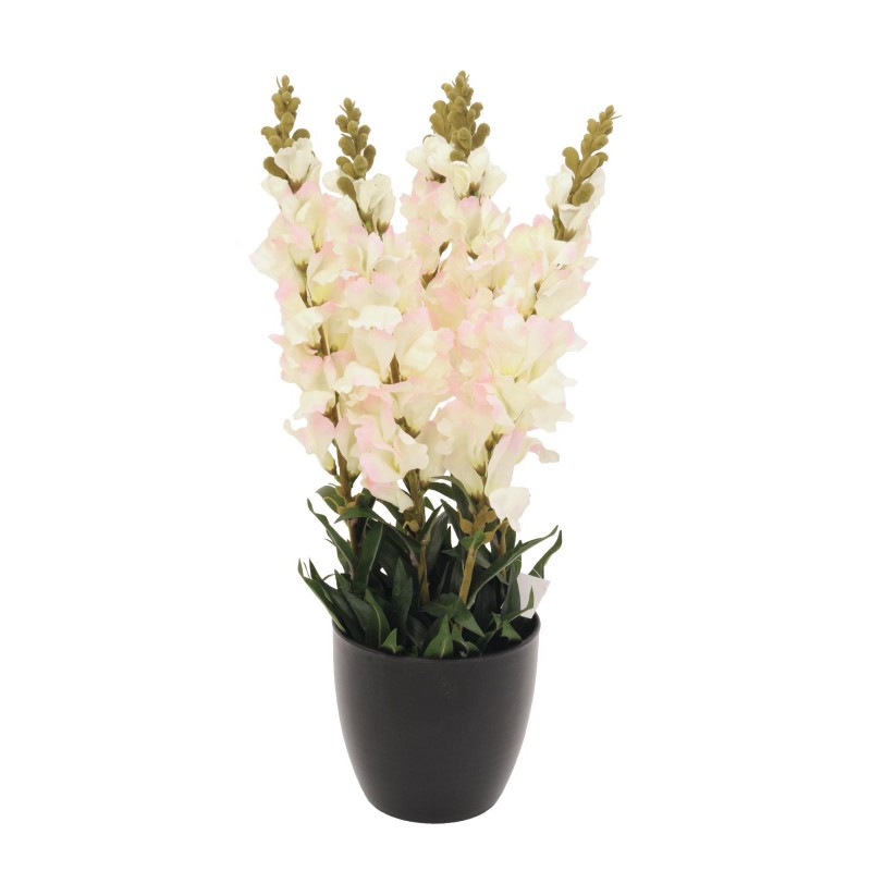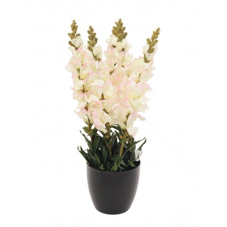 Bring a piece of summer into your home or business premises with the artificial snapdragon from Europalms.The beautiful perennial consists of 5 flower stems with the typical slender, oval leaves and white flowers made of textile. It is delivered in a design container covered with artificial moss and is ready to use immediately. With just a few simple steps you can set floral accents.Herbaceous, strong flowering, with lush flowers in delicate shades of colour - these characteristics have made snapdragon one of the most popular bedding plants for many decades. It can be found in Mediterranean gardens, cottage gardens or typical farm gardens.