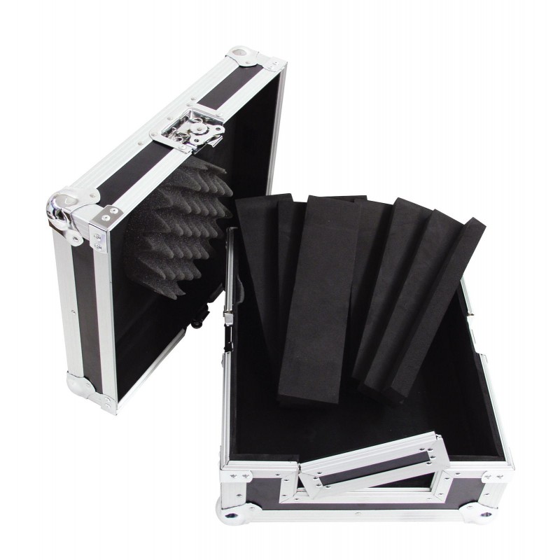 DJ flightcase for tabletop DJ CD playersThe ROADINGER CD player carrying case is especially suitable for DJs who want their tabletop CD player always safely stored. The carrying case has a removable lid and a removable front panel for CD players with front slot.The foam padded interior, the aluminium profile frame with rounded corners and the three-legged, medium-sized steel ball corners provide the necessary stability. In addition, the flight case is equipped with two high-quality butterfly locks and padded handles.The optional adapter strips for fitting CD players are included in the package.