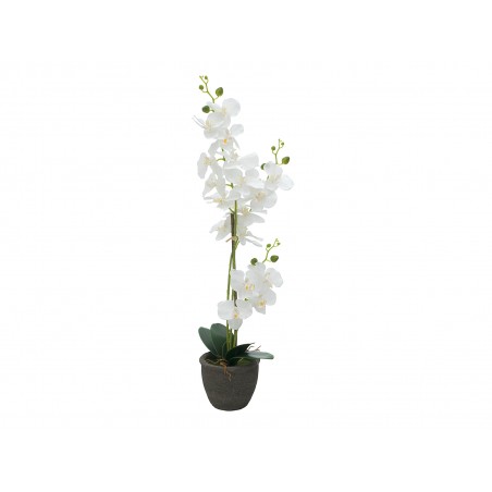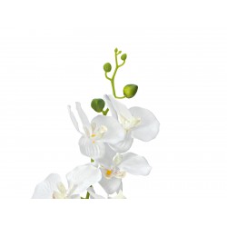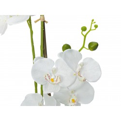 The wild beauty of orchids has always fascinated humans. However, orchid plants are also considered to be very demanding and sensitive."Light, but no direct sun", "Avoid draughts", "Fertilize regularly, but not too much", "Diving instead of watering - but only with rainwater", these are just some of the care instructions that often prevent us from buying these exotic plants.The artificial orchid from Europalms, however, is completely undemanding and does not blame you for any mistakes in its care. It has 3 flower stems of different lengths with textile flowers that feel waxy when touched and therefore hardly differ from the real plant. Closed PE buds are located at the tips of the flower stems. Slightly bent, the plant reaches a total height of approx. 80 cm.Leaves of EVA material and aerial roots complete the lifelike appearance.The artificial plant is particularly suitable for window or counter decorations in residential and business areas.The plant is supplied already in a natural stone optics pot (approx. 16cm diameter).