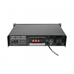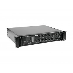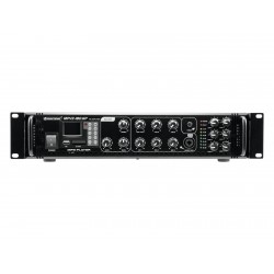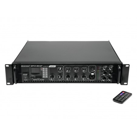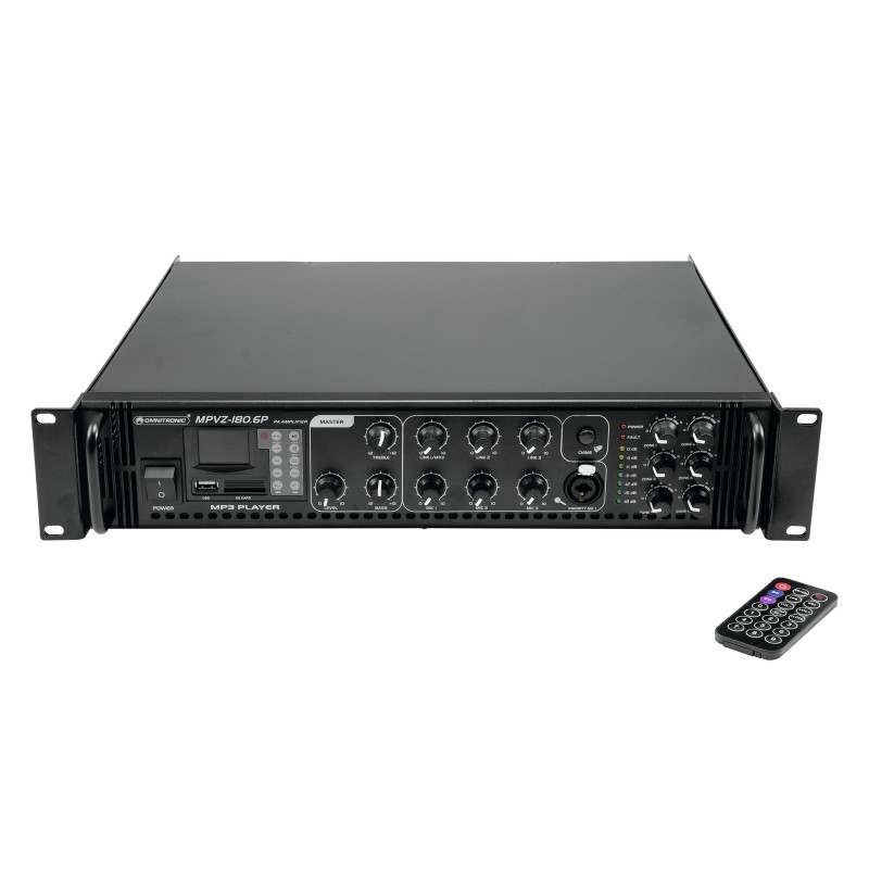 Enormous reliability with a maximum of flexibility The Omnitronic MPVZ-180.6P ELA mixing amplifier is your reliable partner for ELA sound reinforcement systems. Thanks to its 19" format, it is ideal for both mobile and permanent installations. Outputs for ELA loudspeakers with 70 V and 100 V audio transformers or 4-16- Ohm loudspeakers leave nothing to be desired. In addition, you can also connect a device with line level (e.g. mixing console) to the line output. You are always flexible with 6 mixable inputs. Connect up to 3 microphones and 3 line level devices. Control your ELA speakers conveniently via the 6 zone outputs of the MPVZ-180.6P. They are separately adjustable on the front panel with a 5-stage volume control. For you, this means the greatest possible adaptability when implementing your sound reinforcement concept.The MPZ-180.6P also offers you an MP3 player with infrared remote control and blue backlit LCD display. It has both an SD card slot and a USB port. So you can spontaneously and flexibly play music titles from a storage medium of your choice.Make yourself heard! The microphone input 3 on the front panel has an adjustable priority switch. It allows you to make important announcements with automatic, continuously adjustable level reduction of all signals. Use the gong to draw additional attention to your announcement. ProtectionA fan protects the interior of your MPVZ-180.6P from overheating. In addition to a switch-on delay, it has protection circuits against overvoltage and short-circuits. In these cases, your speakers are electrically isolated from the amplifier. This protects both the MPVZ-180.6P and your speakers from damage.