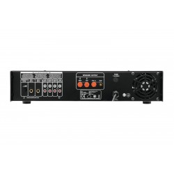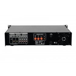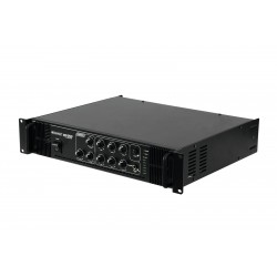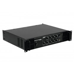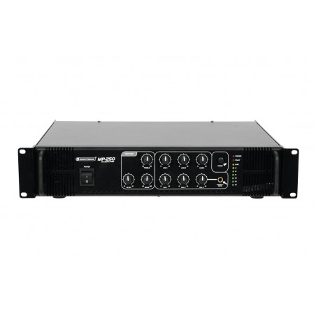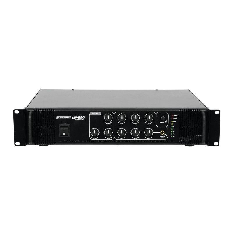 High reliability with a maximum of flexibility The Omnitronic MP-250 ELA mixing amplifier is your reliable partner when working with ELA sound systems. Thanks to its 19" format, it is ideally suited for both mobile and fixed installations. Outputs for ELA loudspeakers with 70 V and 100 V audio transformers or 4-16 ohms loudspeakers leave nothing to be desired. In addition, you can also connect a device with line level (e.g. mixing console) to the line output. With 6 mixable inputs you always stay flexible. Connect up to 3 microphones and 3 line level devices. Announcements are a priorityThe microphone input 3 on the front panel offers an adjustable priority circuit. It enables you to make important announcements with automatic, continuously adjustable level reduction of all signals. Use the gong to additionally point out your announcement. Protective features A fan protects the interior of your MP-250 from overheating. In addition to a switch-on delay, it has overvoltage and short-circuit protection circuits. In these cases, your speakers are electrically isolated from the amplifier. The FAULT LED lights up then and both the MP-250 and your speakers are protected against damage.