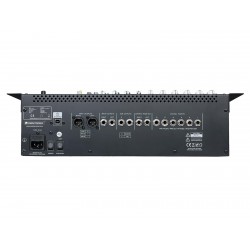 Input chanel: 6 x mono via XLR or jack, channel control via 60mm fader, 3-band EQ-Poti with semiparametric mid-band EQ ±15dB at 80Hz/100-8kHz/12kHz, 3 Send/AUX, pre-post switch, adjustable single-knob compressor, Mute control, Routing Sub group bus switch, Routing master bus switch, low cut switch, panoramacontol, gain control, solo switch Input chanel: 4 x stereo via Plug 6,3mm/3,5mm (Jack), channel control via 60mm fader, 4-band EQ-poti EQ ±15dB at 80Hz/500Hz/3kHz/12kHz, 3 Send/AUX, pre-post switch, Routing Sub group bus switch, Routing master bus switch, Mute control, solo switch, low cut switch, balancecontrol, Input sensitivity switch, Master output: 1 x stereo, channel control via 60mm fader, Graphic equalizer 9-band EQ ±12dB at 63/125/250/500Hz 1/2/4/8/6kHz