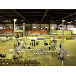 QUADLOCK TQ390 4-point truss systemQUADLOCK TQ390 is a 4-point truss system made of aluminum. The individual elements are connected via four cones, pivots and pins.The advantage of the conical connection system is that the cones completely fit into the main chords so that highest load capacity is guaranteed. The Quick-Lock system enables fast, efficient and highly aesthetic assembly when the truss constructions are frequently assembled and dismantled.The four main chords are made of 50 mm aluminum tube with 2 mm wall thickness and offer a good relation between strength and weight. The braces have a diameter of 20 mm with 2 mm wall thickness and provide higher strength and load capacity.With 390 mm outer dimensions, QUADLOCK TQ390 is a stable truss system for higher loads and extended durability. This system is mainly designed for intense use in stage installations, fair installations, event installations but also for permanent installations in discotheques and theatres.Due to its higher outer dimensions and the enforced braces, larger structures for tour stages, large discotheques etc. can be realized.The production of this truss system is TUV-monitored. The load table as calculation base can be downloaded from the Internet before buying the product!Please note: this truss system must never be combined with other systems!