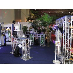 QUADLOCK TQ390 4-point truss systemQUADLOCK TQ390 is a 4-point truss system made of aluminum. The individual elements are connected via four cones, pivots and pins.The advantage of the conical connection system is that the cones completely fit into the main chords so that highest load capacity is guaranteed. The Quick-Lock system enables fast, efficient and highly aesthetic assembly when the truss constructions are frequently assembled and dismantled.The four main chords are made of 50 mm aluminum tube with 2 mm wall thickness and offer a good relation between strength and weight. The braces have a diameter of 20 mm with 2 mm wall thickness and provide higher strength and load capacity.With 390 mm outer dimensions, QUADLOCK TQ390 is a stable truss system for higher loads and extended durability. This system is mainly designed for intense use in stage installations, fair installations, event installations but also for permanent installations in discotheques and theatres.Due to its higher outer dimensions and the enforced braces, larger structures for tour stages, large discotheques etc. can be realized.The production of this truss system is TUV-monitored. The load table as calculation base can be downloaded from the Internet before buying the product!Please note: this truss system must never be combined with other systems!