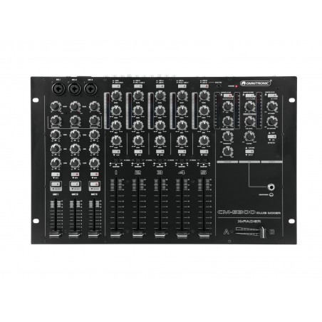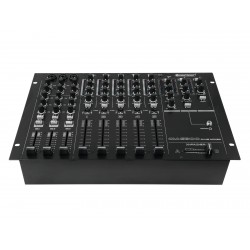 | Chanals: | Input chanel: 2 x stereo with Line-AUX switch via RCA or jack plug, channel control via 100mm fader, 3-band tone control EQ, gain control, CUE switch, Crossfader selector switch, Input chanel: 2 x stereo with Line-Line/Phono switch via RCA, channel control via 100mm fader, 3-band tone control EQ, gain control, CUE switch, Crossfader selector switch, Input chanel: 1 x stereo with Line-line switch via RCA, channel control via 100mm fader, 3-band tone control EQ, gain control, CUE switch, Crossfader selector switch, Microphon chanal: 3 x mono via 3-pin XLR/6.35mm jack (F) combination socket (mounting version), channel control via 60mm fader, 3-band tone control EQ, gain control, adjustable single-knob compressor, ON AIR switch, FX routing switch Master output: 1 x stereo via XLR or RCA, channel control via Rotary knob, Level attenuator, Master output: 1 x mono + stereo via RCA or jack plug, channel control via Rotary knob, Level attenuator, Zone output: 1 x mono via XLR, channel control via Rotary knob, source selector, Level attenuator, low cut switch, Subwoofer output: 1 x mono via XLR, Level attenuator, hi-cut control, Headphones output: 1 x stereo via Plug 6,3mm/3,5mm (Jack), channel control via Rotary knob, Cue mix split function, |
