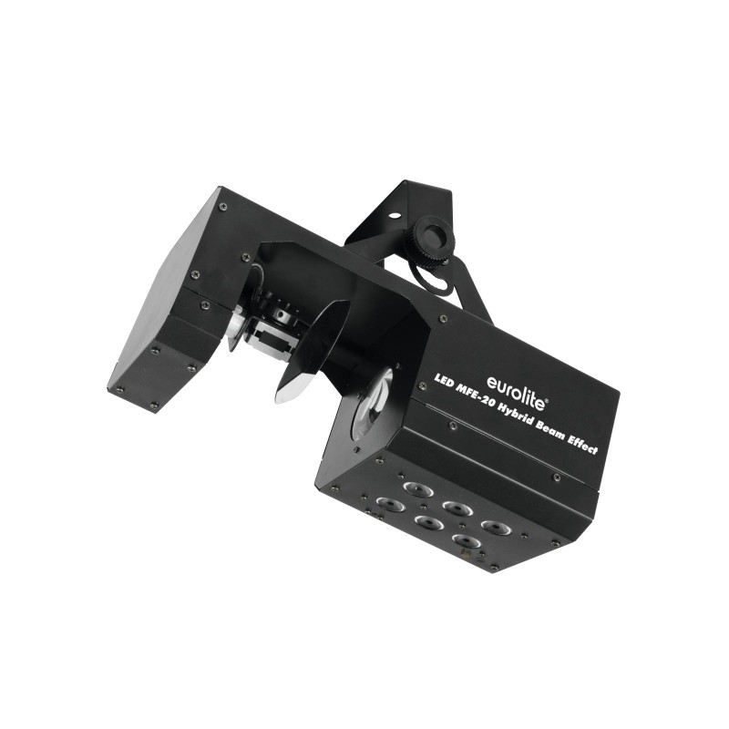 The LED MFE-20 Hybrid Beam Effect by Eurolite is everything you need to illuminate all kinds of parties. This compact scanner can be controlled either in stand-alone mode, via DMX (4 or 13 channels) or IR remote.The deflection mirror creates rapid color changes and its angle can be adjusted manually or automatically. The sensitivity of the integrated microphone can be adjusted manually.A high-power 10W quad-color LED in the colors red, green, blue and white works together with an extra set of white strobe LEDs at the bottom of the device to create a true color explosion matching music of all kinds of genres: You can choose from static colors, preset programs, RGBW mixed colors as well as strobe effects.If you wish to link multiple hybrid beam effects to illuminate bigger rooms, simply use the master/slave function and the devices work in sync.The MFE-20 comes in a sturdy all-metal enclosure that sports an adjustable bracket, 3-pin DMX connectors as well as an IEC mains input and a feed-through output for daisy-chaining up to 8 units.