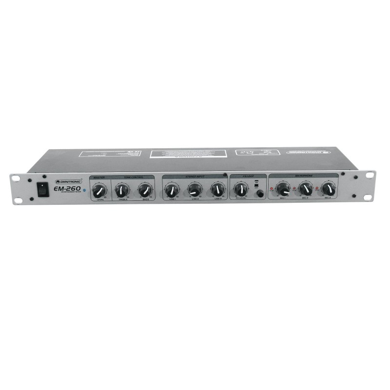 | Chanals: | Input chanel: 3 x stereo via RCA, channel control via Rotary knob, 2-band tone control EQ 100Hz/10kHz Microphon chanal: 3 x mono with Mic-line switch via XLR, channel control via Rotary knob Master output: 1 x stereo via Plug 6,3mm/3,5mm (Jack), channel control via Rotary knob |