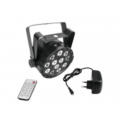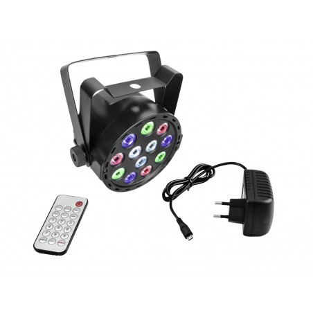 Compact & battery-powered color changerPortable and colorful? The AKKU Mini PARty RGBW spot by Eurolite makes it possible! This compact lighting wizard is completely battery-operated and includes various preset programs to illuminate your birthday party, family reunion and more. Strong LEDs in bright colorsThe particularly compact and lightweight device comes equipped with twelve energy-saving 1-watt LEDs in the colors red, green, blue and white covering floors, walls and ceilings in all desired colors. Thanks to the double-yoke you can place or mount the spot wherever you see fit.Powerful batteryThe modern LED technology makes the device so energy-efficient that it can be operated for up to three hours before having to be recharged with the supplied power adapter or any USB power source.Light dances to the rhythm of the musicA microphone is integrated as well so that the rhythm and color adjust to the rhythm of the music. Strobe effects, slowly fading colors or rapid color changes for more fast-paced songs - this spotlight has it all!