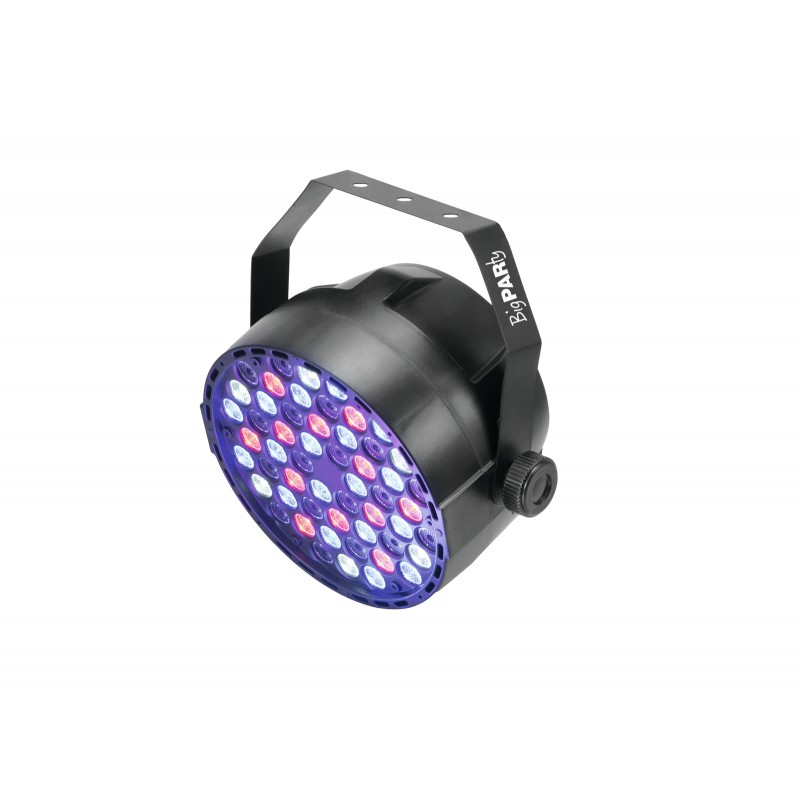 Big performerGreat effects for great parties: This LED spot by Eurolite is equipped with a total of 54(!) LEDs creating amazing light effects.Strong LEDs in bright colorsHigh-performance LEDs in the colors red, green, blue and white illuminate the room in any color combination of your choice. By choosing the stand-alone mode, you let the Big PARty run the show itself by adjusting the colors and fade speed to the rhythm of the music through the built-in microphone. Alternatively, you can use a DMX controller to control the spot manually.Highly flexibleThanks to the mounting bracket, you can mount the Big PARty almost everywhere. The installation is so easy that even beginners can do it. Impress your audience with a vibrant color mixture, dimmer and strobe effects or static colors. This spot is perfectly suited for every occasion!