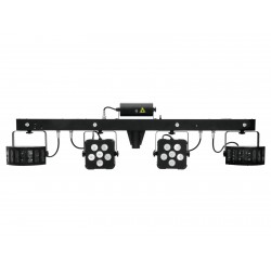 Bar with 2 strong derbies and spots, white/UV strobe LEDs, laser (RG, 2M)