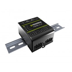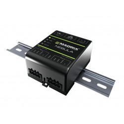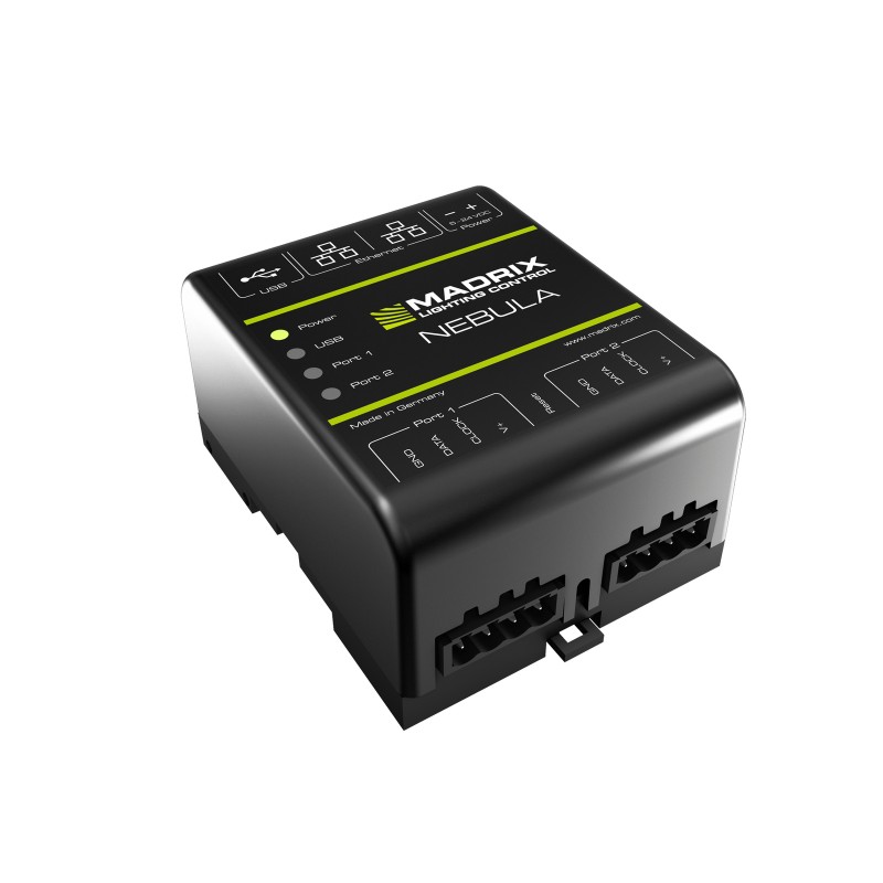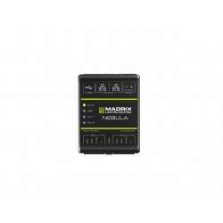 Provides flexible power options: over USB (5 V) or via screw terminal (5 V to 24 V / 12 A) as well as routing through to LEDs with up to 6 A maximum load per port with various options on how to connect LEDs, power, and MADRIX NEBULA
