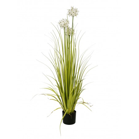 With the artificial allium grass from Europalms, you can bring a piece of summer into your home or business premises. It is versatile and with a few simple steps you can set targeted floral accents.The perennial has a total height of about 120 cm and consists of 3 umbels of different heights with star-shaped flowers in white. These are surrounded by lushly arranged, strap-shaped foliage leaves made of PE, which already fall into shape by themselves when placed.As a cover of the included basic garden pot serve incorporated pebbles and artificial moss. Thus, it can serve as a stand for a planter, as well as be used as a decorative pot.