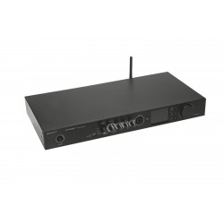 Stereo receiver with internet radio, DAB+, Bluetooth, 2 x 460 W / 4 ohmsWith the flat stereo receiver DJP-900NET, you receive high-quality net radio from thousands of free radio stations around the globe. The DJP-900NET also supports the digital radio DAB+ with all its advantages compared to the old FM radio. This sustainable new standard of radio broadcasting in digital quality is not only noiseless and independent from the internet but also puts an end to the tedious frequency search. Simply connect the device to your WiFi network to provide your shop, restaurant or gym with clear radio reception. In case you prefer to listen to your own playlist, you can also use the Bluetooth function of the receiver to wirelessly stream music from any Bluetooth device. The DJP-900NET additionally complies with the DLNA standard and streams your library from your WiFi network. Simply select your audio files via the dimmable TFT display and play your music via the receiver.The integrated high-power class D amplifier provides 2 x 460 watts at 4 ohms or 2 x 240 watts at 8 ohms and can play and control music from various analog and digital sources. For double output power it is possible to switch to bridge mode. Then 900 watts are provided. The screw terminals can be connected to low impedance loudspeakers (4 to 16 ohms) and 100-volt PA speakers. Additionally, the DJP-900NET is equipped with Toslink and coaxial connectors for various other terminal devices. The DJP-900NET can be easily controlled via the big jog dial or the supplied remote control. Your favorite radio stations can be conveniently organized via a web interface. The sound can be adjusted to your expectations and your speakers using various equalizer effects. An alarm and sleep timer are also integrated. The robust metal housing has an aluminum front plate and mounting strips for rack installation. The package content includes an English user manual, a WiFi rod antenna, an FM and DAB cord antenna and the remote control.