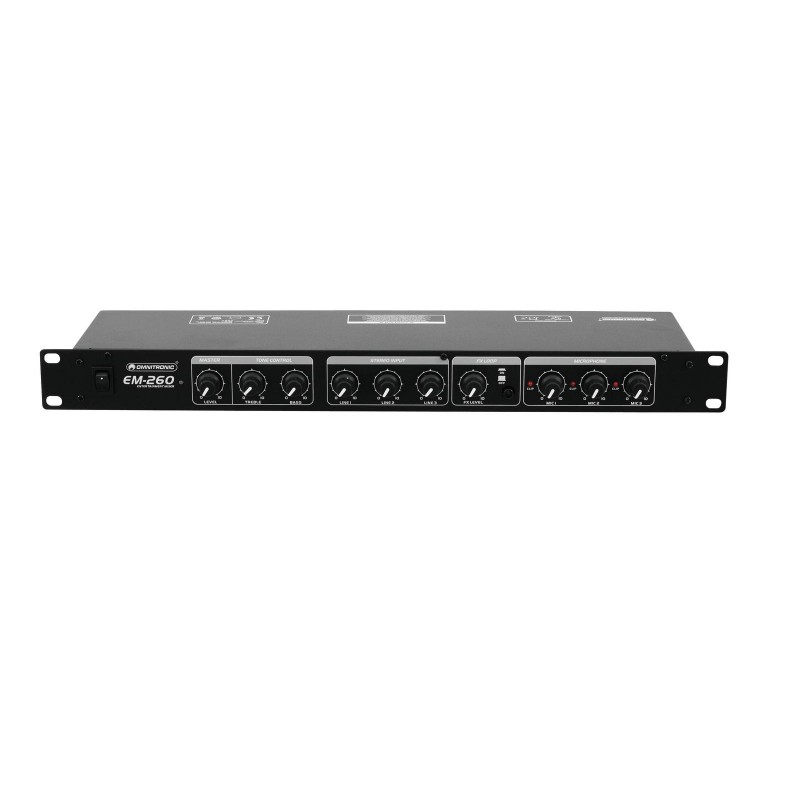 | Chanals: | Input chanel: 3 x stereo via RCA, channel control via Rotary knob, 2-band tone control EQ 100Hz/10kHz Microphon chanal: 3 x mono with Mic-line switch via XLR, channel control via Rotary knob Master output: 1 x stereo via Plug 6,3mm/3,5mm (Jack), channel control via Rotary knob |