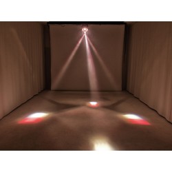 Functions: stepless RGBW color mixture, mirror rotation with adjustable speed in both directions, strobe effect with adjustable speed and random strobe effect, built-in programs, dimmer