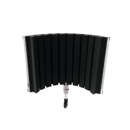 Microphone absorber system for studio and live applicationsThis microphone absorber system from OMNITRONIC is ideally suited for your studio and live applications.The chrome-plated steel frame is equipped with a high-density acoustic foam and can reduce disturbing noises such as reflections and echoes in an optimal way. In addition, it minimizes background noise during vocal and instrumental recordings.The stand screw clamp is suitable for all common microphone stands with standard inside threads. It is mounted behind the microphone with adjustable distance.