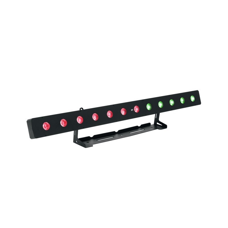 Light bar (100 cm) with 12 x 10 W 6in1 LED (RGBAW+UV), pixel controlThe EUROLITE LED PIX-12 HCL bar features 12 powerful 10 W LEDs (6in1) in red, green, blue, amber, white and UV with a beam angle of 20°. It is suitable for professional applications, for example on show stages or in theatres. The LED bar provides stepless RGBAW+UV color mixing. Each of the 12 LEDs can be controlled individually. In addition to use in stand-alone mode or via music control, the bar can also be controlled via DMX and in master-slave mode as well as with the supplied infrared remote control.Addressing and settings can be made via the integrated control board with four control buttons and LED display.The mains connections allow you to operate up to eight devices in a row.