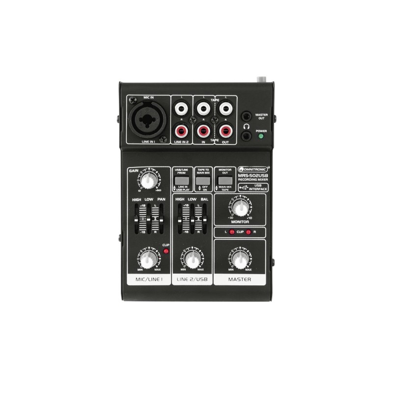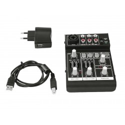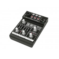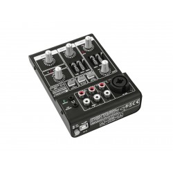 | Chanals: | Microphon chanal: 1 x mono via XLR or jack, channel control via Rotary knob, 2-band tone control EQ 80Hz/12kHz, gain control, panoramacontol, Input chanel: 1 x stereo with Line-USB switch via RCA or USB, channel control via Rotary knob, 2-band tone control EQ 80Hz/12kHz, balancecontrol, Master output: 1 x stereo via Plug 6,3mm/3,5mm (Jack), channel control via Rotary knob Headphones output: 1 x stereo via Plug 6,3mm/3,5mm (Jack), channel control via Rotary knob |