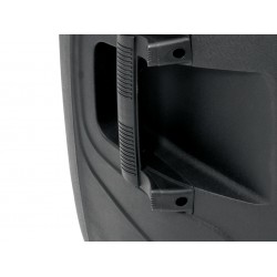 Light-weight black plastic enclosure with metal grille, monitor shape and carrying handles