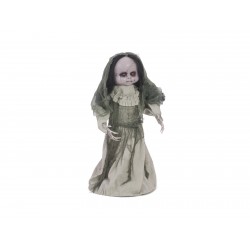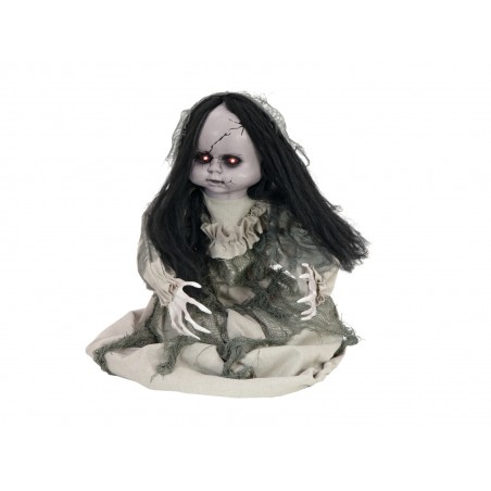 This animated ghost doll is perfect for decorating Halloween, haunted houses and theme parties.Long black hair frames the pale, furrowed child's face of the girl desperately calling for her mother. As if moved by a ghostly hand, she walks back and forth on the floor as she stretches her arms towards the visitors. Flashing red LED eyes complete the animation of the ghost puppet of Europalms.The upper body, mounted on a mobile base, rotates thanks to rollers in the base plate and moves forward at the same time - a movement area of at least 1m² should be provided. If the figure encounters an obstacle, it automatically turns away again. The animation is activated by an integrated microphone or wired manual control.