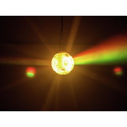 The Twinkle Ball by Eurolite offers you mesmerizing colors and soft rhythms in living rooms, party rooms, smaller clubs and more while working fully automatically.Enjoy dimmed light emitted by this milky white ball made of robust plastics. On the inside, the LED pendant is equipped with two high-quality RGB LEDs in red, green and blue automatically switching colors. As the Twinkle Ball is connected to a motor by a 55 cm long cable, the lighting effect seems to float above the ground while painting the floor, walls and ceiling with fantastic colors. Perfectly suitable for a permanent installation!Control is left to the music: Watch the light and speed change to the rhythm of the music. Thanks to the fuzzy sound control the show goes on even when the music skips a beat. Since the device is run by energy-saving LED technology, there is no need to worry about the costs for a permanent operation. The Twinkle Ball can be continuously used throughout the whole year.